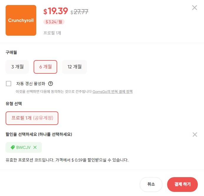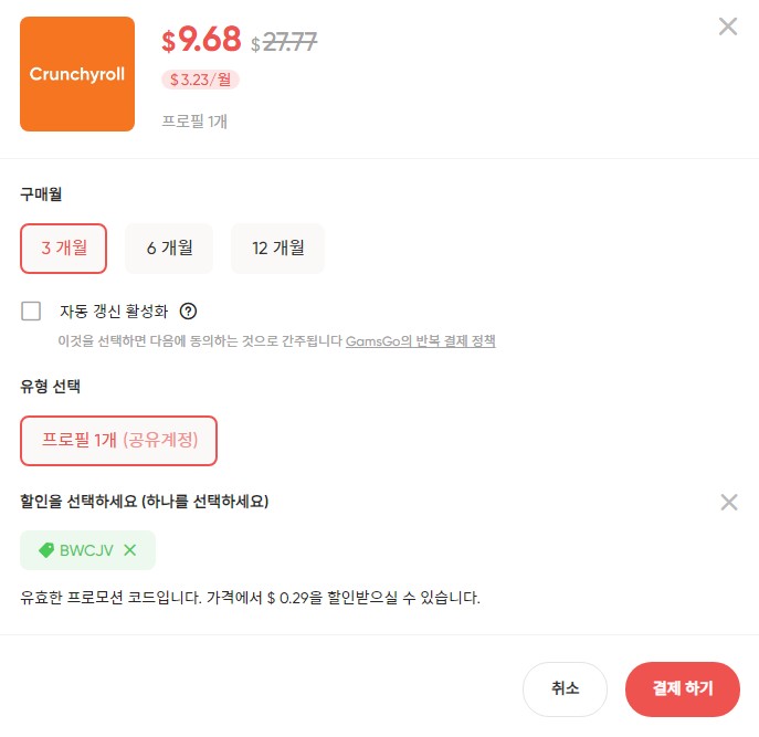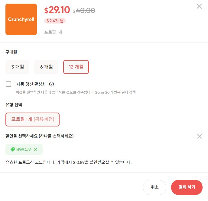 crunchyroll은 할인 쿠폰 적용하여 3개월($9.68), 6개월($19.39), 12개월($29.10) 구독이 가능합니다.