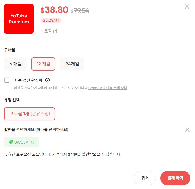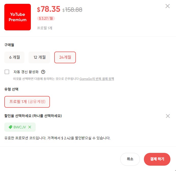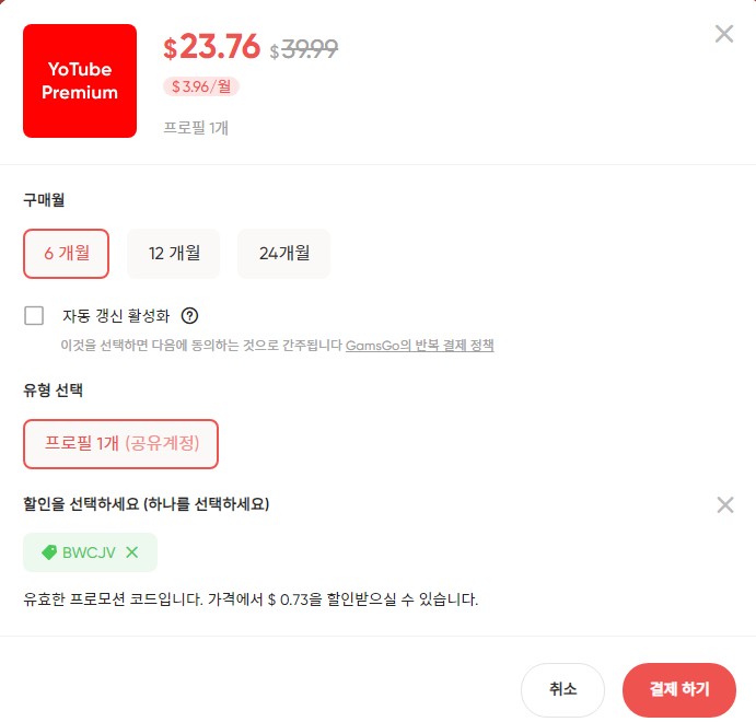 유튜브 프리미엄은 할인 쿠폰 적용하여 6개월($23.76), 12개월($38.80), 24개월($78.35) 구독이 가능합니다.