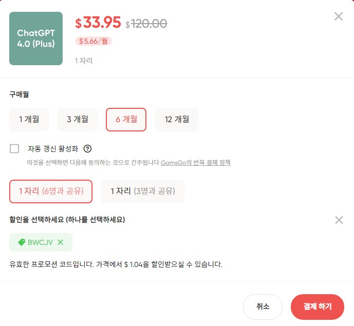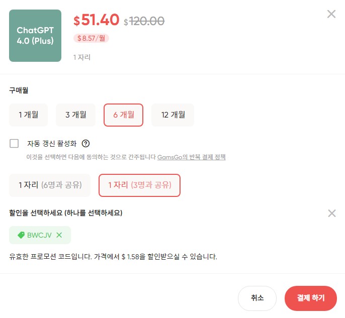 저는 1자리(3명과공유) 12개월 상품을 가입하였습니다.