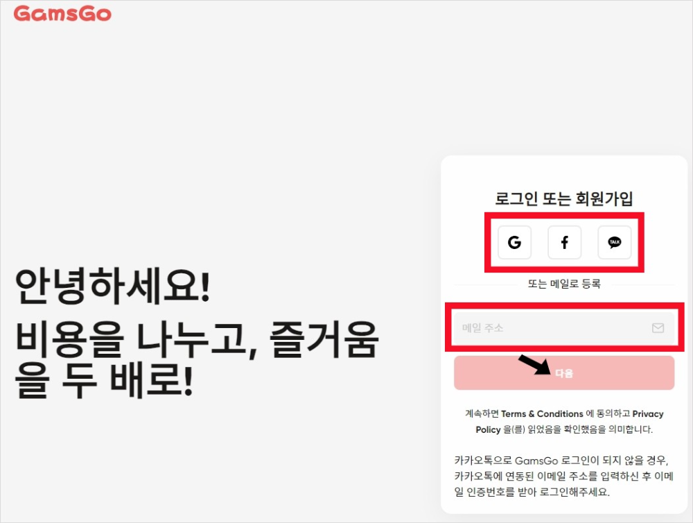 겜스고 GamsGo 홈페이지에서 구글, 페이스북, 카카오톡으로 로그인하거나 이메일 주소로 회원가입을 합니다.