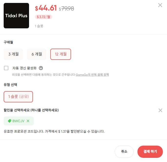 타이달 플러스는 할인 쿠폰 적용하여 3개월($10.65), 6개월($20.36), 12개월($44.61) 구독이 가능합니다.