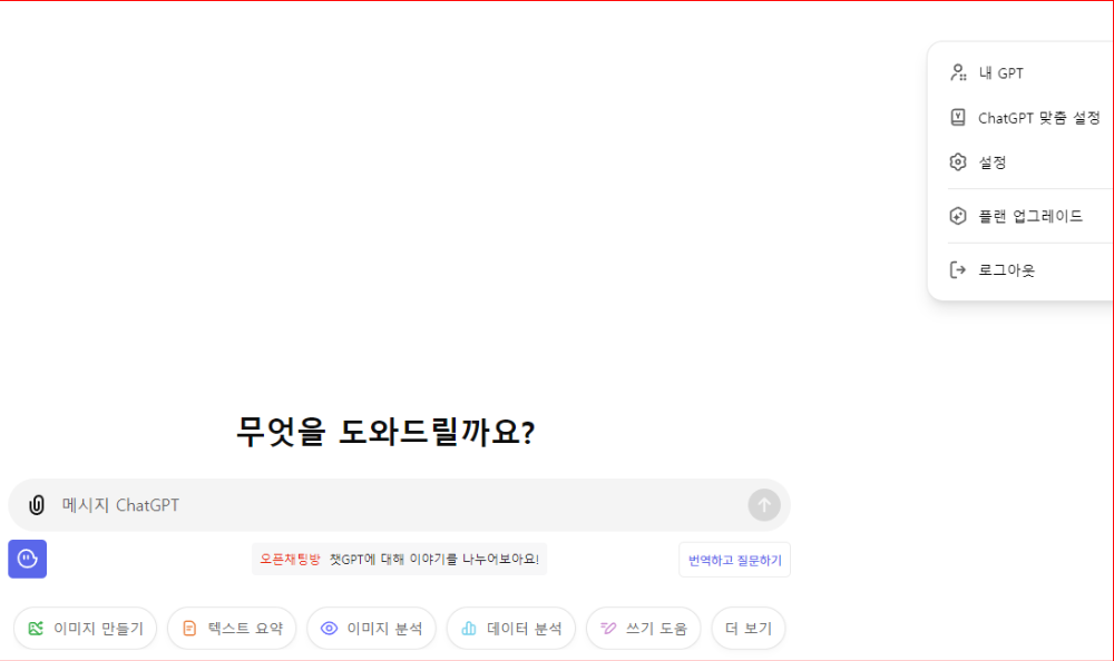 왼쪽 상단에는 내 GPT, ChatGPT 맞춤 설정, 설정, 플랜 업그레이드를 설정할 수 있는 화면이 나옵니다.