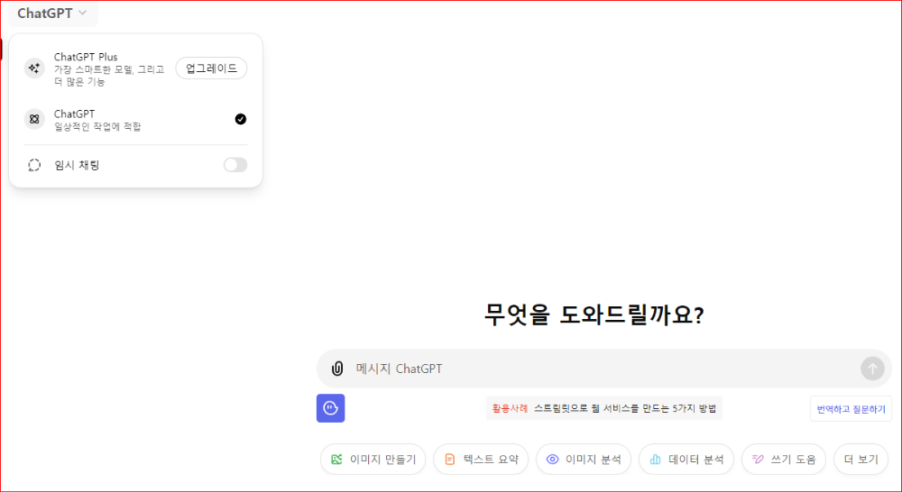 상단왼쪽에 ChatGPT가 선택되어 있으며, ChatGPT Plus는 업그레이드 해야 사용이 가능하다고 나옵니다.