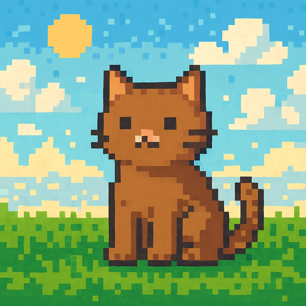 • pixel art of a cute cat sitting on green grass, bright colors, 8-bit retro style